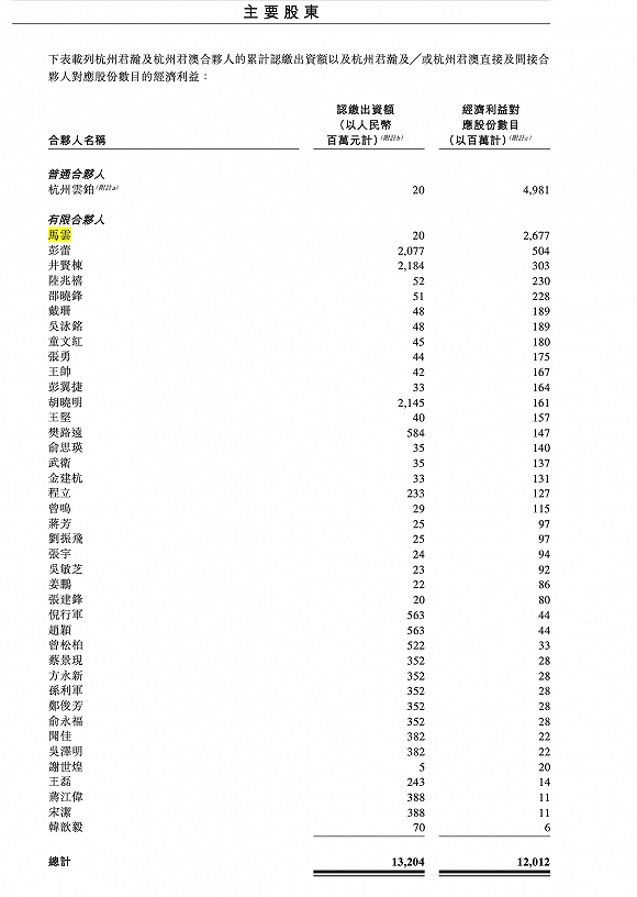 至于外界备受关注的高管持股,招股书显示,40名蚂蚁集团有限合伙人共计持有蚂蚁集团超过120亿股;其中,持有蚂蚁集团超过1亿股份的有19位高管,马云、彭蕾、井贤栋分别持有蚂蚁金服26.77亿股、5.04亿股和3.30亿股。