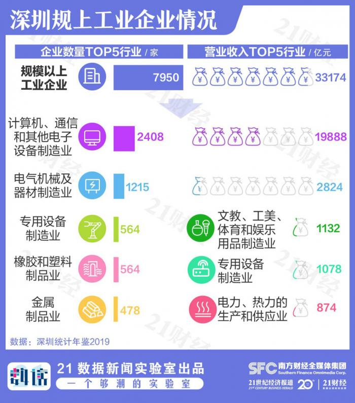 以规模以上工业企业为例,改革开放初期,深圳从“三来一补”起步,企业以食品制造业、纺织业等传统制造业为主,到如今先进制造业实力抢眼。据21数据新闻实验室统计,截至2018年底,深圳规模以上工业企业中,大约37%分布于计算机、通信、专用设备等先进制造业,营业收入占比达63%。