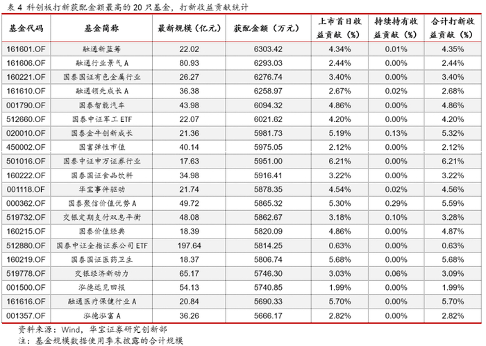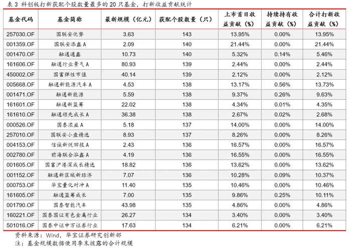 我们使用基金在季报、半年报、年报中披露的规模数据,作为该基金在之后一个季度内规模的近似估计,从而估算每个季度内科创板打新对基金收益率的贡献。同时,将新股的收益贡献拆分为上市首日收益贡献和持续持有收益贡献两类:如果在基金季末披露的持仓数据中出现了该季度内上市的新股,我们认为该基金没有在新股上市首日执行卖出,而是持有直到持仓披露日,这部分收益记为持续持有收益贡献;与之相对,未在持仓披露数据中出现的新股,我们认为该基金在新股上市首日执行卖出,这部分收益记为上市首日收益贡献;将每个季度的两类收益贡献分别加总后,可以得到科创板打新对基金的收益贡献估计。