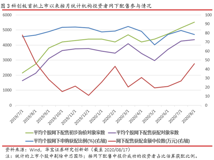 机构投资者对科创板新股网下配售的参与热情不断升温。参与网下配售初步询价的投资者数量从2019年7月的平均每只个股2157家,增加到了2020年8月的平均每只个股5525.09家,增了一倍有余。与此同时,按照网下配售最终获配对象家数/网下配售初步询价对象家数估算的网下申购获配比例,其个股平均值则一直稳定在80%左右,获配比例并没有随参与报价机构的增加而下降。