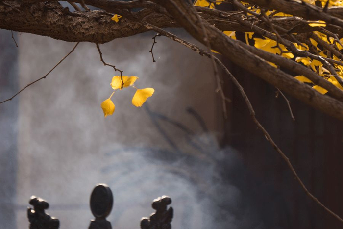 过午时分,抬眼的一瞬,只见满树灿然,天上纷飞、风中摇曳、地上黄叶堆积……如万丈佛光透入心扉。