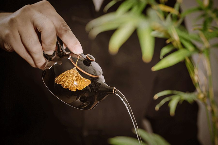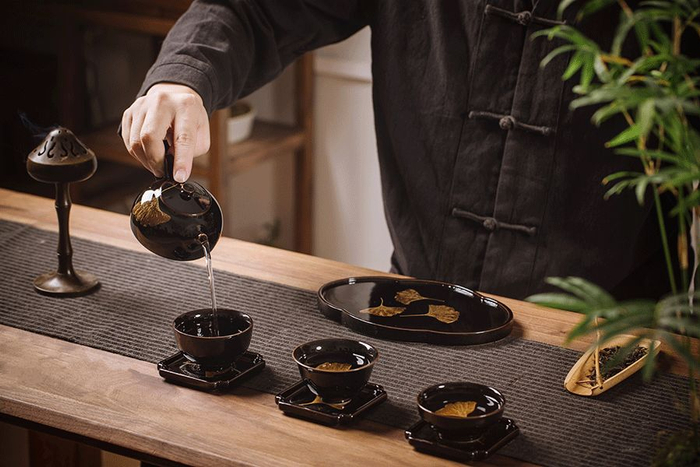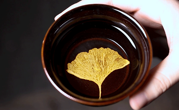 乌黑油亮的茶盏内,一片银杏金叶栩栩如生。倒水入盏,银杏好像浮在水中,禅意悠扬。