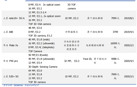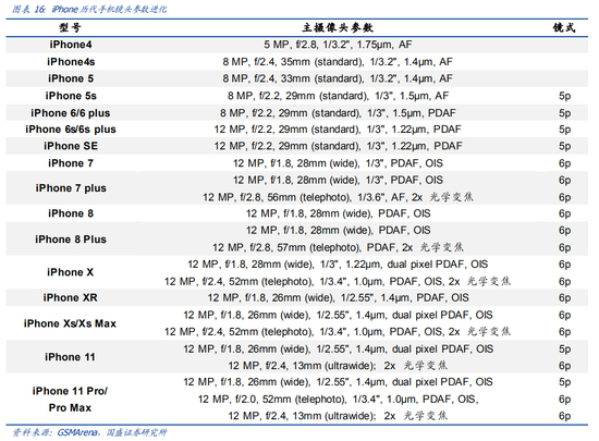 iPhone 迭代印证镜头向更高片数结构过渡趋势。自 iPhone5s 开始,苹果就采用了 5P的镜头结构,于第七代 iPhone 起正式启用 6P 镜头结构且一直沿用至今,我们可以看到在 iPhone 11 Pro 系列,已经出现了一个 5P 镜头搭配 2 个 6P 镜头的主摄配臵。聚焦国产品牌也有强势表现,如 2019 年底发布的小米 CC 9 Pro 旗舰手机,后臵四摄中的 108MP镜头便直接采用了 8P 的结构。