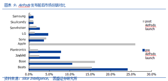 AirPods 在发行短短一个月时间内就成为美国最受欢迎的无线耳机,根据市场调研机构Slice Intelligence 的数据,发行短短一个月已占据 26%的市场份额,超过 Beats 和 Bose 耳机的份额。