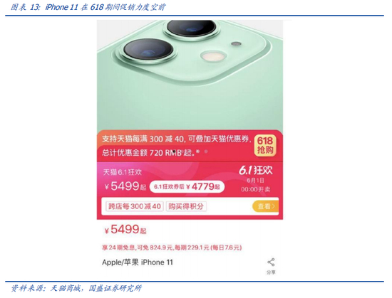 今年上半年刚推出的 iPhone SE 在 618 器件直接八折,而且 12 期免息,还直降 200 元等一系列的促销使得 618 期间 iPhone 5 个小时的成交额超过 5 亿元,创下史上最快纪录, 成交额相当于中国市场的 1 天成交额。由于 iPhone 促销的成功,也为整个苹果产业链带来了不小的订单拉动。