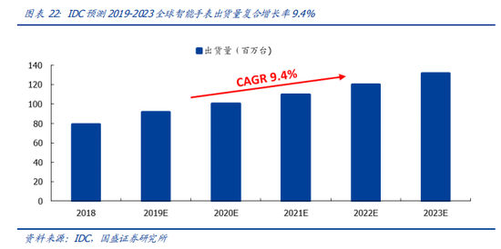 智能手表出货量快速增长,是可穿戴设备的主要产品之一。自 2014 年三星首次推出智能手表以来,智能手表的出货量迅速增加,2018 年全球出货量达 79.1 百万台,相比 2014年增长近 80 倍。根据 trendfore 数据,2019 年全球智能手表出货量为 6263 万块,同比增长 43%。根据市场调查机构 IDC 的预测,2023 年市场规模将增加至 1.32 亿台。随着 Apple Watch 以及来自其他电子产品制造商的各种智能手表越来越受欢迎,智能手表在整个可穿戴设备市场的份额将从去年的 44%增长到 2023 年的 47%。
