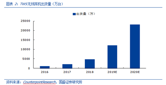 CounterpointResearch 预测,2020 年 TWS 无线耳机的出货量将达到 2.3 亿副,相对于2019 年仍然继续维持翻倍的增长。随着蓝牙技术的升级、3.5mm 耳机孔的取消以及 TWS 耳机体验感的提升,未来 TWS 耳机市场前景广阔。