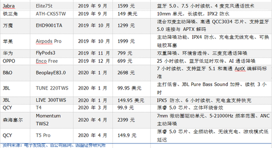 通过统计今年年初至今发布的 TWS 耳机,我们发现 TWS 耳机的售价逐渐下探。苹果 的AirPods 主打高端市场,售价均为千元以上,华为、小米、漫步者等厂商的 TWS 耳机价格覆盖了不同价格段位。例如漫步者 TWS NB2 蓝牙降噪耳机,预售时间为 5 月 31 日20:30—6 月8 日23:30,预售到手价仅为499 元。小米的TWS 主打性价比,Redmi AirDots S 仅需 99.9 元。