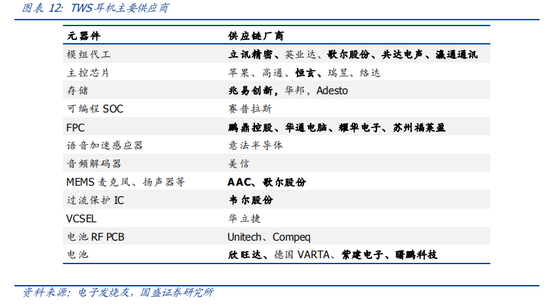 TWS 的产业链主要包括 ODM 厂商,无线耳机的元器件厂商,其中包括主控芯片、存储芯片、FPC、语音加速感应器、MEMS、过流保护 IC、电池等。