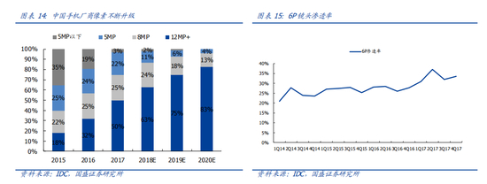 高像素、多镜片,手机厂商推动镜头规格升级换代。旗舰机种的像素不断升级,后臵主摄率先由2000 万逐渐升至4000 万,而前臵摄像头也紧跟逐渐由800 万升级至2400 万, 拍照效果提升。为追求超级大广角和大光圈,在高像素的基础上,国内高端机种的镜头也逐渐由 5P 向 6P 过渡,IDC 预计 2018 年后臵镜头的 6P 渗透率约为 40%。而对对极致夜拍效果的追求,促使手机厂商不断升级摄像头的光学变焦,从最初的二倍,到现在的三倍甚至更高倍数。
