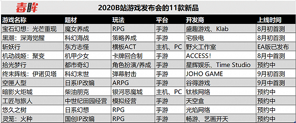 近年来,B站游戏还在加速布局,让玩家拥有更多的选择。今年5月,B站发布的一季度财报提到,在2020年接下来的时间中,B站拥有超过30款高质量游戏储备,其中有8款已获得版号并预计年内上线。