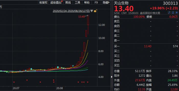 至8月26日14:11,天生生物已升至13.4元,而在6个交易日前的18日该公司收盘价仅为5.83元,一个星期的时间累计涨幅达129.84%,相比于部分创业板新股也不逊色。