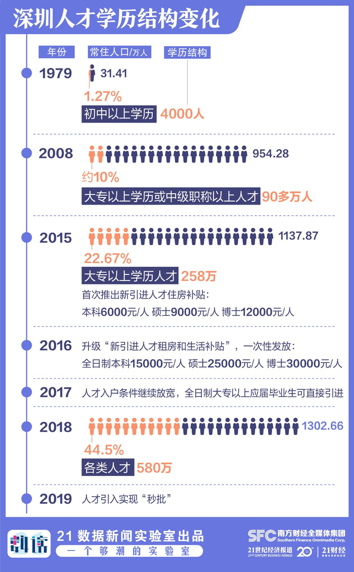 在一系列措施吸引下,2017年深圳户籍人口猛增50万人,创历史最高纪录。2018年,深圳接收应届毕业生10.8万人,同比增长7%,连续5年创新高;同年深圳各类人才已达到580万人,占常住人口44.5%。