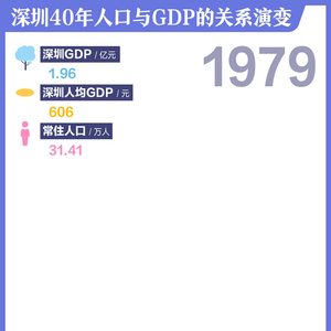 庞大且增长迅速的人口,对深圳来说意味着强大的生产力和消费力,是经济社会发展的源泉。21数据新闻实验室统计数据发现,40年间,深圳GDP实现惊人增长,从1.96亿上升到2.69万亿,增长近1.4万倍(同期全国增长241倍),年均增长28%;人均GDP从606元增长至20.35万元跃升为全国第一,增长334倍(同期全国增长167倍)。