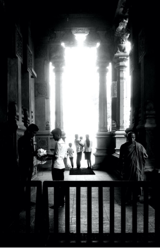 A:我日常也会使用手机记录生活。2018年我在斯里兰卡科伦坡旅行,当时正值当地雨季,我们将车停在一处寺庙门口避雨,专业的摄影器材都放在了车里。在寺内避雨的时候,我看到并用手机抓取了这样一个场景,当时使用的正是华为手机:整个画面采用U形构图,中间是一家四口,右侧是一位步履从容的僧侣,左侧则是一对互换礼物的兄弟。这一瞬间的画面包罗了世间万象,因此我为它取名为《我们从哪里来,到哪里去》。