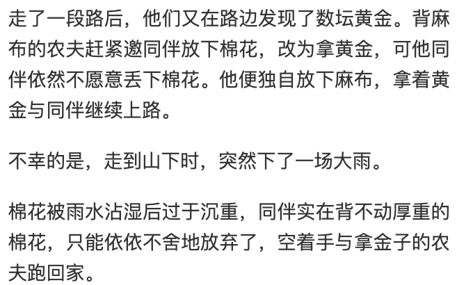 坚持,本是一种良好的品性。但无谓的坚持,就会让你多走许多弯路。坚持背棉花的农夫,若懂得及时改变自己的想法,就不会错失了麻布和黄金的机会,最后连棉花也不得不放弃。