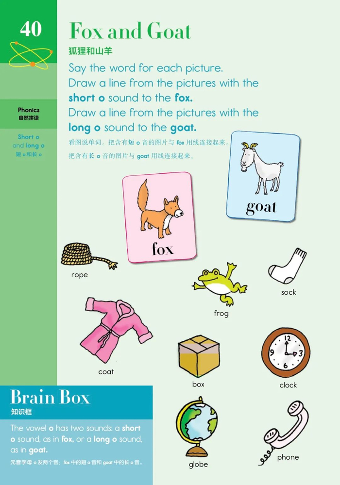 小学1年级的自然拼读,依旧延续连线的方式,但增加了知识框的内容,让孩子逐渐学习发音和词汇构成等更深入的东西。