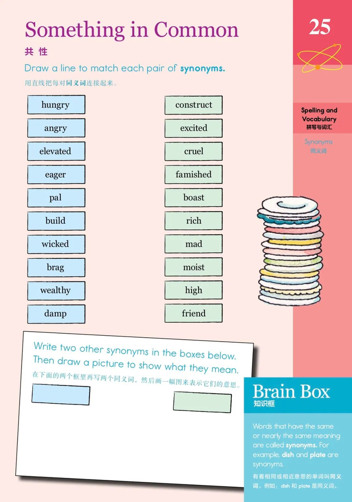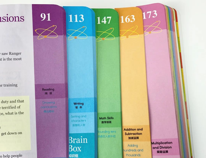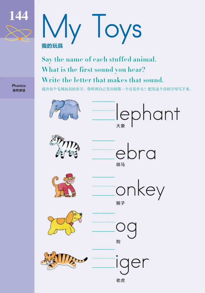 引入原版的时候,考虑到要保留原教材的精华,同时也方便英语基础不好的家长辅导孩子,书里在自然拼读、阅读、写作、单词等语言科目,都采用了双语模式。