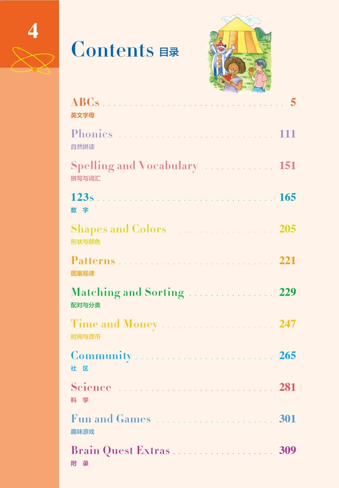 “字母”和“数字”从学前就开始接触;“自然拼读”二年级之后就不讲了;“词汇”与“科学”两个科目贯穿整个系列;四年级开始教“概率与数据”……