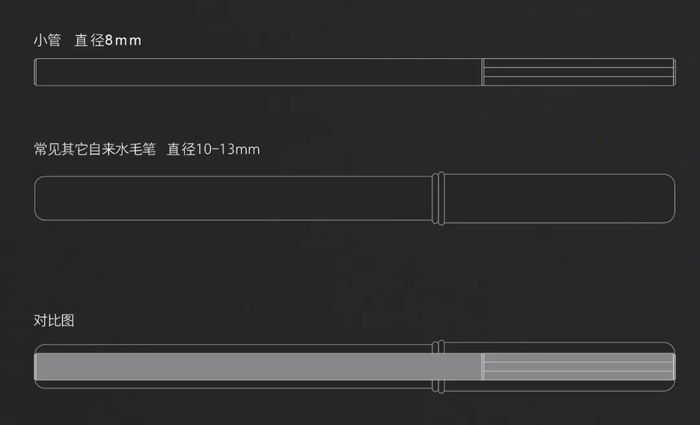 多数自来水毛笔由于直接采用市面通用钢笔组件,导致其外观异常粗大,直径超过13mm的比比皆是,既书写不便,也缺少优雅的握持美感。