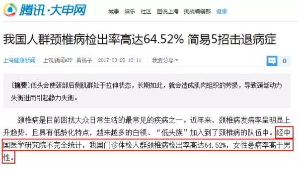 几年前,中国医学研究院针对对门诊体检的人做了一项不完全的统计,结果发现我国人群颈椎病检出率竟然高达 64.52% !