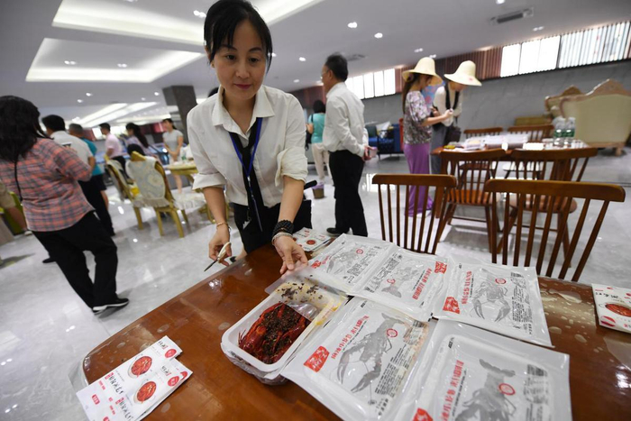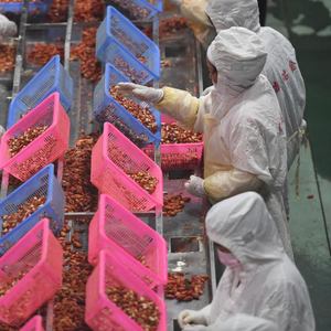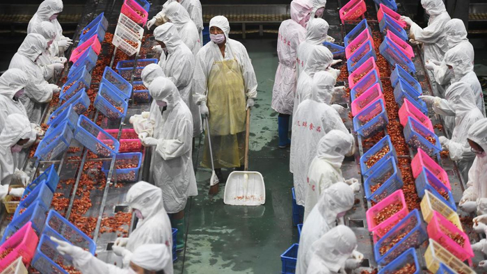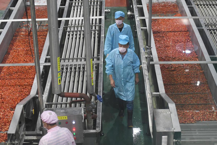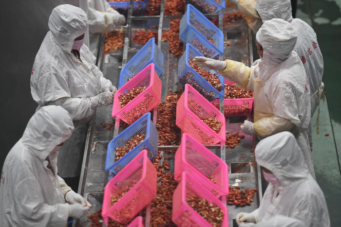 中国日报8月26日电(记者 王健 摄影 魏晓昊)江西省九江市彭泽县凯瑞田园综合体内,工人们正在流水线上加工小龙虾。稻虾共作养殖、小龙虾精加工、小龙虾冷藏、小龙虾活储、产品质量检测……小龙虾做成了一项大产业。