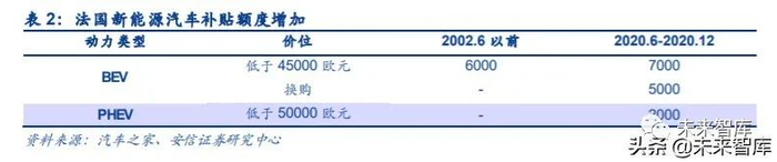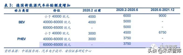法德电动汽车刺激政策持续加码。2020 年 5 月 26 日法国宣布实施 80 亿欧元援助计划,将 为购买电动车的消费者提供最高 7000 欧元的补贴;同时,为鼓励大众更换混合动力或电动 汽车,于 6 月 1 日实施的“旧车换现金”计划将向驾车者提供 5000 欧元的奖励。2020 年 6 月 3 日,德国出台 1300 亿欧元经济复苏计划,强制要求国内所有加油站提供充电桩,或将 成为全球首个在全国范围内强制推行电动车充电的国家;此外,为刺激电动汽车的消费,该 计划将对拥有低效率燃油 SUV 的车主征税,对购买售价低于 4 万欧元的电动车用户提供 6000 欧元的补贴。目前,算上原本 3000 欧元的制造商补贴,德国对电动车的购买补贴总额 最高已达 9000 欧元。
