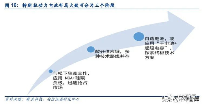 在电池领域,特斯拉主要以外购为主,其动力电池布局大致可以分为三个阶段:
