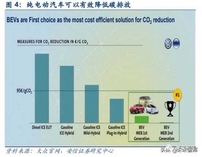 欧盟新法案于 2020 年正式实施。2019 年 4 月 17 日,欧盟通过新法案 Regulation (EU) 2019/631,要求自 2020 年 1 月 1 日起,境内 95%的新登记乘用车平均二氧化碳排放量需降 至 95g/km,碳排放超出标准的企业将面临罚款的问题;到 2021 年,全部新车需达到此要求。2030 年开始,新登记乘用车平均二氧化碳排放量将继续降低至 59.375 g/km。但从 2017 年 的排放数据看,主要车企距离 2020/21 排放标准仍有较长的距离。根据大众的数据,相比汽 油汽车和柴油汽车,发展纯电动汽车将有效降低碳排放,更有助于车企达到 95g/km 的排放标准。因此为尽快满足排放标准的要求、避免遭受罚款损失,各车企大力发展新能源汽车, 尤其是纯电动汽车便显得格外重要。