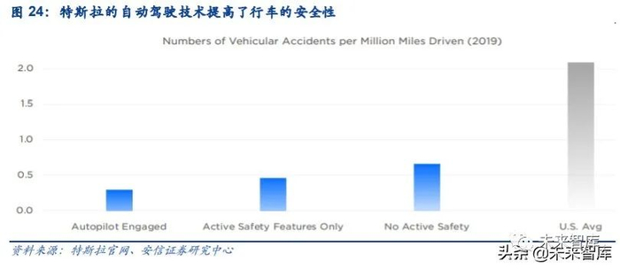 大众和特斯拉虽然均实现了较高的 EEA 集成度,但两者在智能化的侧重点上有所区别。特斯拉的智能化主要体现在自动驾驶领域。在智能化应用软件方面,Autopilot 是特斯拉目前最 重要的应用软件。Autopilot 即汽车辅助驾驶系统,按照结构框架可分为感知模块、地图模块、 驾驶行为决策模块。感知模块包含雷达、传感器、摄像头等硬件,主要用以收集周围环境探 测到的物体数据。地图模块可提供全局路径规划和定位功能。驾驶行为决策模块接收来自感 知模块和地图模块的数据,从而为驾驶方案提供信息支持,控制车体转向、加速等实施行为。根据特斯拉官网,该项技术提高了行车的安全性,2019 年,一辆特斯拉的自动驾驶汽车在 美国每行驶百万英里仅发生 0.3 起事故,远低于美国的平均水平(每行驶百万英里发生 2.0 起事故)。