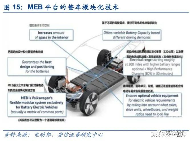 随着时间的推移,大众进入到了模块化策略时代,平台技术得到了更大的提升。在电动化发 展成为大势所趋的今天,大众推出了 MEB 平台。大众 MEB 平台采用整车模块化技术,将电 池组、电机等核心组件均设定在固定的位臵,并将电池整体嵌入车底,使得车辆具有较长的 的轴距和较短的前后悬,从而带来更大的驾驶舱空间。该平台具有较好的扩展性,可以延伸 多个级别的所有类型车型,如三厢轿车、两厢轿车、SUV、MPV、两门跑车、敞篷车等,具 有明显的灵活性优势,有助于实现快速和高效的生产过程,帮助公司实现规模效应。随着规 模效应的出现,由于平台不同级别不同类型的车型可以实现核心零部件的大量共用,电机、 电池组等也可以实现高度的标准化,动力性、整车的轮距、轴距、车身形式等各个关键参数 也能自主定义,因此平台实现了在电动车时代的积木化策略,使核心零部件(电池、电机、 电控系统)的通用化率显著提高。在关键部件通用化共享之后,单个零部件会增加极大的采 购量,从而降低采购制造成本以及研发成本。