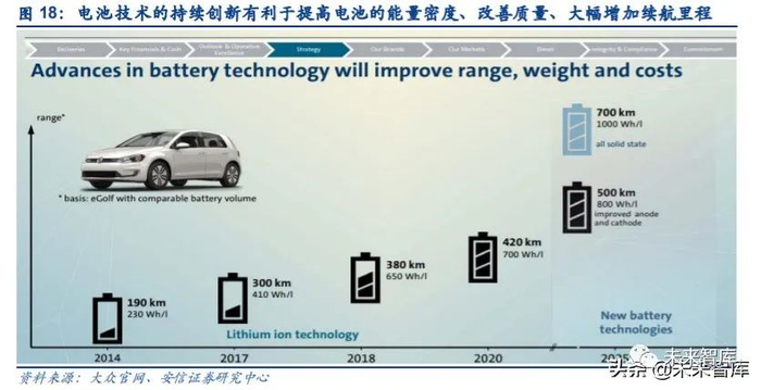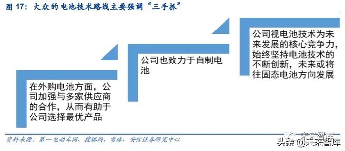 大众的电池技术路线主要强调“三手抓”。首先,在外购电池方面,公司加强与多家供应商 的合作,从而有助于平衡电池价格,帮助公司选择最优产品:公司早期的供应商是松下;从 2016 年开始,公司的电芯供应商逐渐往三星 SDI 和 LG 化学切换;随着 MEB 平台的面世, 2020 年开始,公司在欧美市场和中国市场的主要供应商分别是 LG 化学/SKI 和宁德时代。其次,公司也致力于自制电池。公司与瑞典电池制造商 Northvolt AB 计划在萨克森州萨尔茨 吉特联合生产锂电池,该工厂计划于 2020 年动工建设,2023 年底或 2024 年初开始投产;公司拥有一个电池卓越中心,该机构配臵了约 300 人的专家团队,深度参与集团范围内所有 电池产品的研发,采购和质量管控等,以保障大众汽车电池和电动汽车的成本优势和核心竞 争力。2020 年 5 月 28 日,大众投资 11 亿欧元入股国轩高科,获得国轩高科 26.47%的股份, 成为国轩高科第一大股东,这也宣布大众将全面进驻中国新能源的产业链。国轩高科是国内 仅次于宁德时代和比亚迪的电池供应商,此举表明大众在自制电池的道路上迈出了重大的一 步,有助于保障公司未来电池的供应,也使得公司在国内的汽车供应中拥有规模和成本优势。最后,公司视电池技术为未来发展的核心竞争力,始终坚持电池技术的不断创新。为完成2025 年导入固态电池的目标,以此在下一代动力电池的竞争中取得优势,公司向 QuantumScape 追加 1 亿美金投资。根据大众官网,电池技术的持续创新有利于提高电池的能量密度,随着 电池能量密度的提高,除了更长的续航优势之外,Pack 质量也会更低。