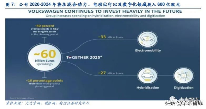 为应对日益严格的排放标准要求,顺应新能源汽车发展的趋势,大众集团作出了相应的战略 规划。2016 年 6 月,大众集团发布 2025 战略,将电动化作为公司重要的发展战略,使之成为推动公司快速发展的驱动因素。2025 战略指出,到 2025 年,公司将推出超过 30 款纯电 动车型(BEV),届时纯电动汽车年销量或将达到 200-300 万辆,占公司总销售份额的 20%-25%。