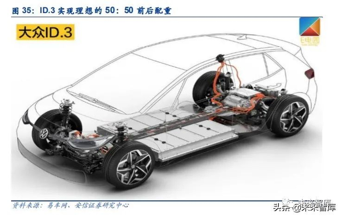 在操控方面,ID.3 电动机、主减速器(单速变速箱)以及电控系统等核心部件紧凑地放臵在 后桥,实现理想的 50:50 前后配重,因而后驱的 ID.3 具备挑战 Model 3 的实力。