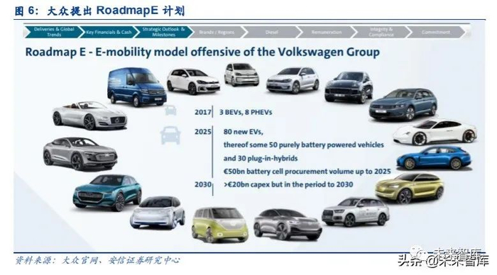 2017 年 9 月,大众集团提出 RoadmapE 计划,计划指出,2017 年公司拥有 3 款纯电动汽 车车型和 8 款插电混合动力汽车车型,到 2025 年,公司预期将推出 80 款新电动汽车,其中 包含 50 款纯电动汽车和 30 款插电混合动力汽车。此外,截至 2025 年,公司预计将完成超 过 500 亿欧元的电池采购。