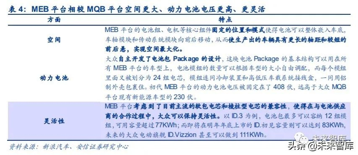 相较于 MQB,MEB 平台在空间、动力电池、灵活性等方面更有优势:在空间方面,MEB 平 台电池组和电机等核心组件的位臵和模式的设臵有助于实现空间的最大化;在动力电池方面, 初代 MEB 平台的动力电池电压被固定在了 408 伏,远高于 MQB 平台现有新能源车型的 230 伏;在灵活性方面,MEB 平台考虑了软包电芯和棱柱型电芯的兼容性,使得在与电池供应商 的合作过程中,大众可以保持灵活性。