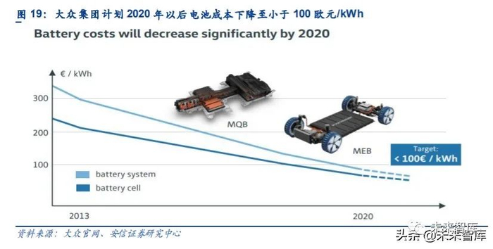 由于相同容量的动力电池,质量明显降低,这将会显著降低材料成本,使得动力电池的成本 大幅降低。根据大众集团的规划,2020 年以后电池成本计划下降至小于 100 欧元/kWh。相 较于特斯拉 2020 年 2 月启动的“Roadrunner”动力电池自产计划所规划的 100 美元/kWh 的动力电池成本,大众的成本规划略高,但两者相差不大。