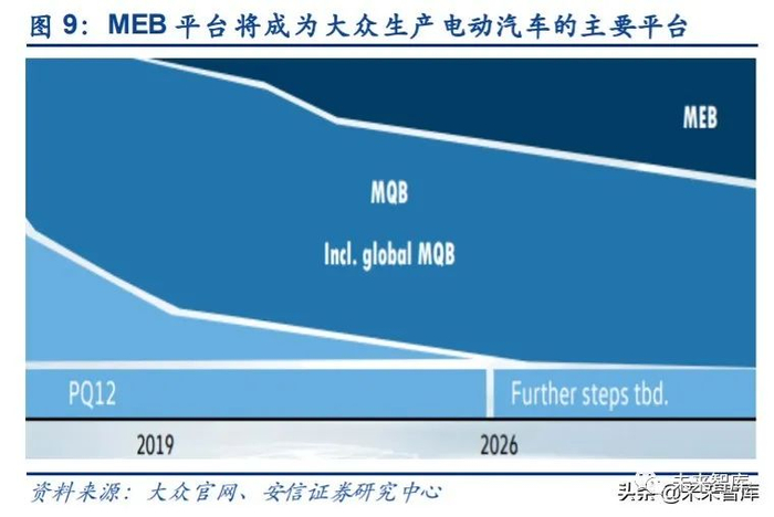 从 2020 年起,MEB 平台将成为大众生产电动汽车的主要平台。MEB 平台即电动车模块化 平台,其与大众目前使用的 MQB 平台具有相似性:两者都是模块化概念,都具有极强的扩 展性,均可根据需求和定位打造不同的车身轴距以及调校不同的续航里程。根据公司规划, 截至 2029 年,200 万辆的电动汽车将在 MEB 平台上生产。