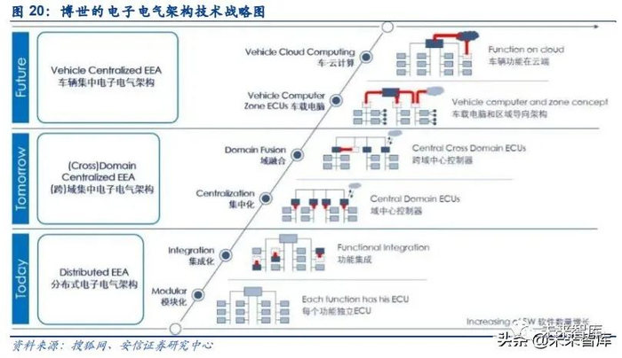 EEA(Electrical/Electronic Architecture)即电子电气架构,首先由德尔福公司提出,它是一 个集合汽车的电子电气系统原理设计、中央电器盒的设计、连接器的设计、电子电气分配系 统设计等为一体的整车电子电气解决方案的概念。随着汽车电动化、智能化、网联化、共享 化如火如荼地开展,汽车的功能越来越多样化和复杂化,电子电气架构也逐渐从分布式架构 到集成式架构演进。根据博世的电子电气架构技术战略图,在分布式阶段,车辆各功能由独 立的电子控制单元(ECU)控制;到了集成式阶段,ADAS、车身控制、多媒体等功能可以 通过域实现局部的集中化处理。