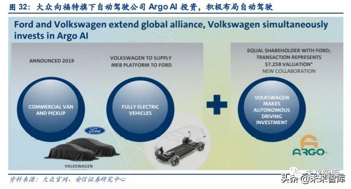 此外,虽然在自动驾驶的智能化方面,特斯拉走在了大众的前面,但本着“迎头赶上”的原 则,大众仍主动布局该领域:2019 年 1 月,大众和福特宣布成立战略联盟,并签署合作协 议。根据协议,双方将积极探索在自动驾驶汽车、移动服务和电动汽车方面的合作。大众还 将向福特旗下自动驾驶公司 Argo AI 投资 26 亿美元,未来,大众和福特所持 Argo AI 公司的 股比相同。