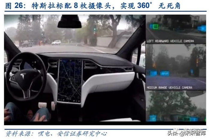 自动驾驶技术的核心要素分别为主处理器芯片、传感器以及算法。主处理器芯片方面,特斯 拉历经了从采购到自研的三代迭代。为进一步提升性能、降低功耗以及采购成本,特斯拉开 始自研芯片,最新的Autopilot 3.0 硬件便搭载了由特斯拉自主研发的高算力芯片:Tesla FSD。该芯片采用 14nm 工艺制造,单芯片可提供 72TOPS 的算力。两枚芯片的总算力高达 144YOPS(每秒万亿次),拥有每秒可处理 2300 帧的图像处理能力,是 HW2.5 版本的 21 倍,计算力提升大约 7 倍。而对于其他的量产车型,算力最高的芯片每秒也最多只能进行 2.5 万亿次的计算,因而特斯拉在该领域具有压倒性的优势;传感器方面,特斯拉标配 8 枚摄像 头,通过这 8 枚摄像头基本实现了 360°无死角;自动驾驶的算法方面,在图形识别、计算 决策、路径规划等领域,特斯拉的算法几乎都是所有车企中最丰富的、数据量最大的,目前 特斯拉已经拥有了 70 亿英里的数据来进行自我训练提升。