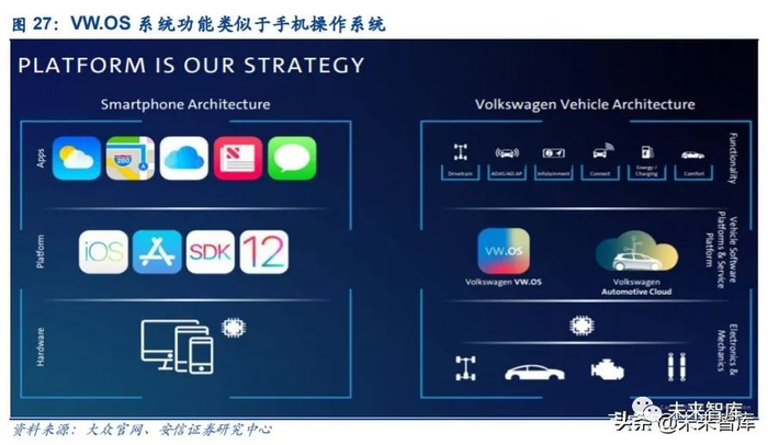 与特斯拉不同,大众的智能化主要体现在操作系统领域。2018 年 8 月,大众宣布将投入 35 亿欧元为整个产品系列开发一种名为“VW.OS”的新软件操作系统,该系统类似于现在的手 机操作系统和其电子载体中央处理器。搭配大众品牌的电动汽车,该系统将从 2020 年起开 始面世。