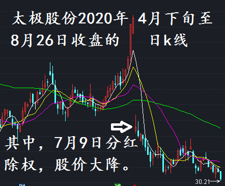所以我们看到,太极股份的股价在7月8日分红除权前的价格是50元出头,但7月9日的收盘价就变成37.18元了。之后震荡走跌,截止到8月26日,收盘价已经变成了30.21元。
