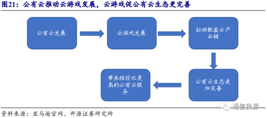 公有云发展推动云游戏发展,随着云游戏产业的快速发展,相关配套产业链将更加完善。公有云业务发展早于云游戏,云游戏发展将推动公有云进一步完善,为企业带来性价比更高的公有云服务。企业发行云游戏绕不开云服务器,而传统游戏也同样可以借力云服务器的生态与算力,随着公有云服务的完善,云游戏有望得到进一步提高。