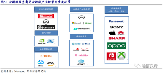 云游戏产业链可分为上中下游。上游包括游戏内容提供商(艺电、育碧、暴雪、索尼、任天堂、腾讯、网易等)、硬件设备提供商(英特尔、英伟达、 AMD等)、云计算服务商(腾讯云、 Azure、AWS)等;中游以云游戏平台(腾讯、微软、谷歌等)和通信运营商(中国电信、中国联通、中国移动、AT&T、 Verizon等)为主,下游则为终端设备商(华为、苹果等),最终达到游戏客户端。云游戏服务商是云游戏市场最为重要的环节,它允许用户可以使用任何一个终端设备访问位于云端的游戏服务器,是目前各大厂商的布局重点。