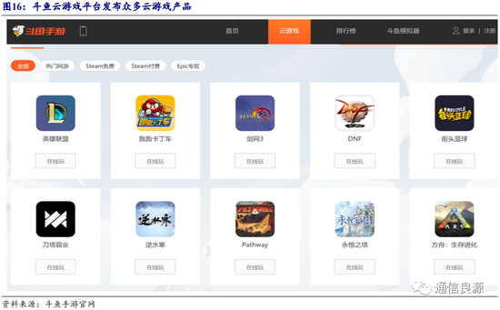 斗鱼依托其直播平台建立了云游戏平台。武汉斗鱼网络科技有限公司旗下的斗鱼是一家弹幕式直播分享网站,前身为生放送直播,于2014年1月1日起正式更名为斗鱼。2020年3月,斗鱼依托其直播平台建立了云游戏平台,并在云端部署了最受斗鱼用户喜爱的近20款端游和30多款手游,包括DOTA2、绝地求生、魔兽世界、星际争霸、王者荣耀、跑跑卡丁车等。