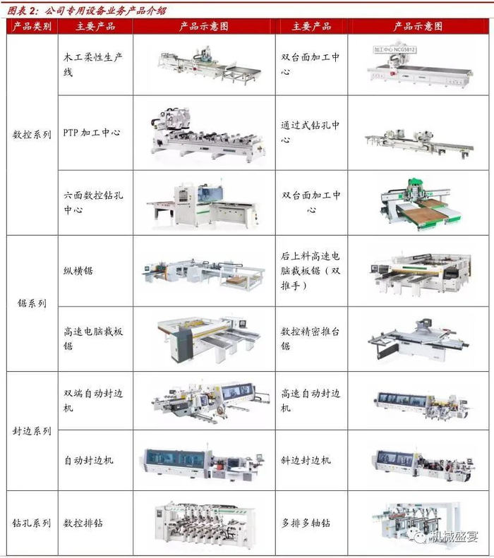 1) 专用设备属于公司传统优势业务,公司可以专业生产板式家具生产线成套设备,并提供卓越的整体解决方案。主要产品包括:全系列高速电脑裁板锯、智能数控开料中心、高速智能封边机、数控排钻、智能数控钻孔中心等产品,广泛应用于全屋定制、衣柜、橱柜、卫浴、木门、办公家具等多个领域。公司在业内率先研发出家具柔性制造生产线,满足了家具生产企业的实际需求。