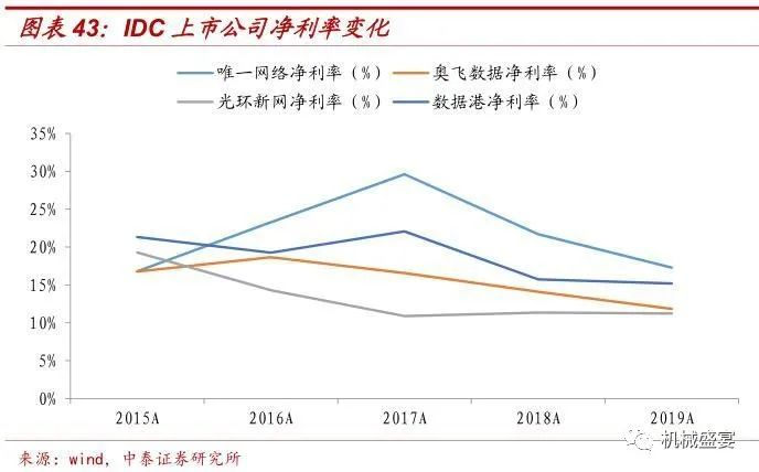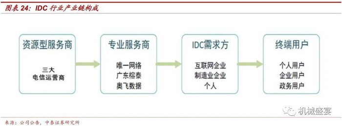 产业链上游:IDC基础运营商。涉及企业包括我国的三大电信运营商及其他电信资源代理商,主要向专业服务商提供基础网络、互联网带宽及机房资源;