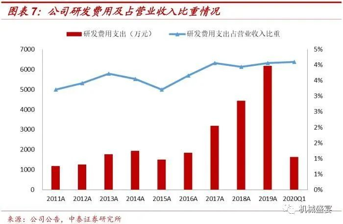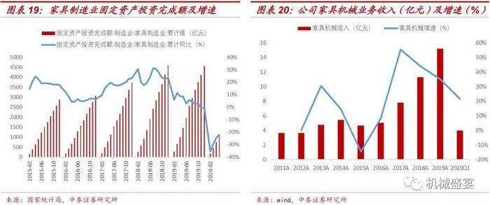 家具制造业柔性化、自动化需求有望增厚公司营收。2019年,家具制造业固定资产投资完成额达4,562.50亿元,同比下降0.70%,增速回落主要原因是房地产调控日趋严厉,作为房地产链条后置环节的家具制造企业直接受到影响。但公司高端数控设备销售持续增长带动业绩增长,2020年第一季度,公司板式家具机械业务实现收入3.97亿元,同比增长21.52%。我们认为,随着家具行业智能化设备需求的进一步提升,公司家具机械收入有望进一步增厚。