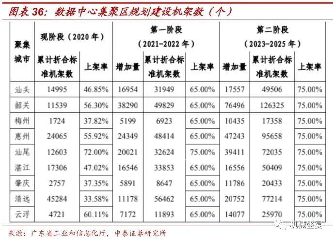 2) 规划建设:到 2022 年底,单个数据中心项目上架率达到 65%以上,规划建设在用折合标准机架数累计约 47万个;到 2025 年底,上架率达到 75%以上,规划建设在用折合标准机架数累计约 100万个。